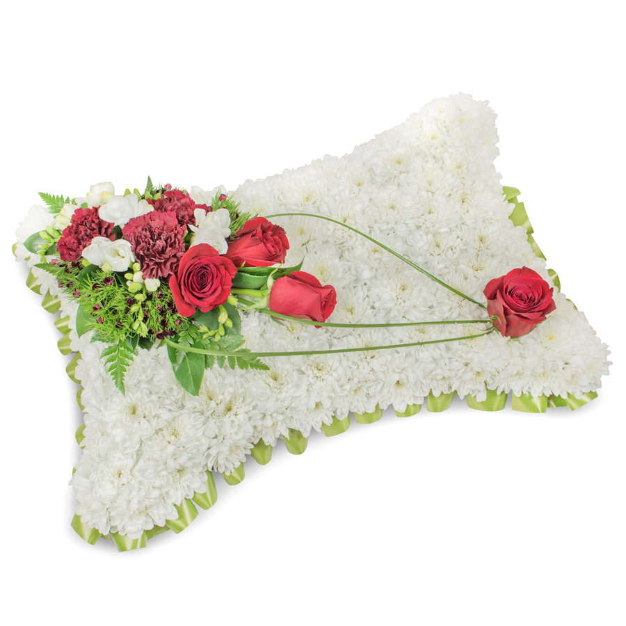 Convey your deepest sentiments with our graceful floral arrangement, a perfect way to send sympathy with a touch of elegance and warmth. This bouquet seamlessly blends the purity of white chrysanthemums with the passionate allure of red roses, accented by the gentle charms of white freesias, dark red carnations, delicate dianthus, and soft bear grass.