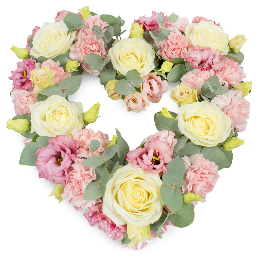 Show your love and appreciation with our beautiful heart-shaped tribute bouquet. This stunning arrangement features a perfect blend of white roses, pink carnations, pink lisianthus, and eucalyptus leaves, creating a visually captivating and meaningful display.